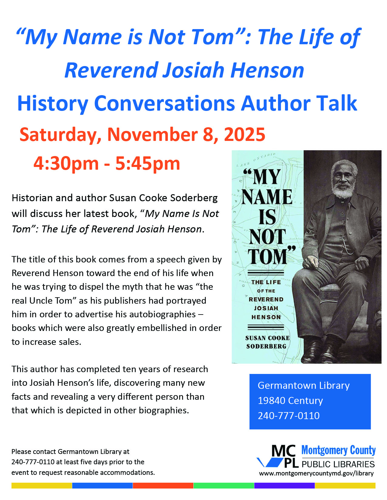 Historian and author Susan Cooke Soderberg will discuss her latest book, “My Name is Not Tom” – The Life of Reverend Josiah Henson. The title of the book comes from a speech given by Reverend Henson toward the end of his life when he was trying to dispel the myth that he was “the real Uncle Tom” as his publishers had portrayed him in order to advertise his autobiographies – books which were also greatly embellished in order to increase sales. Free.